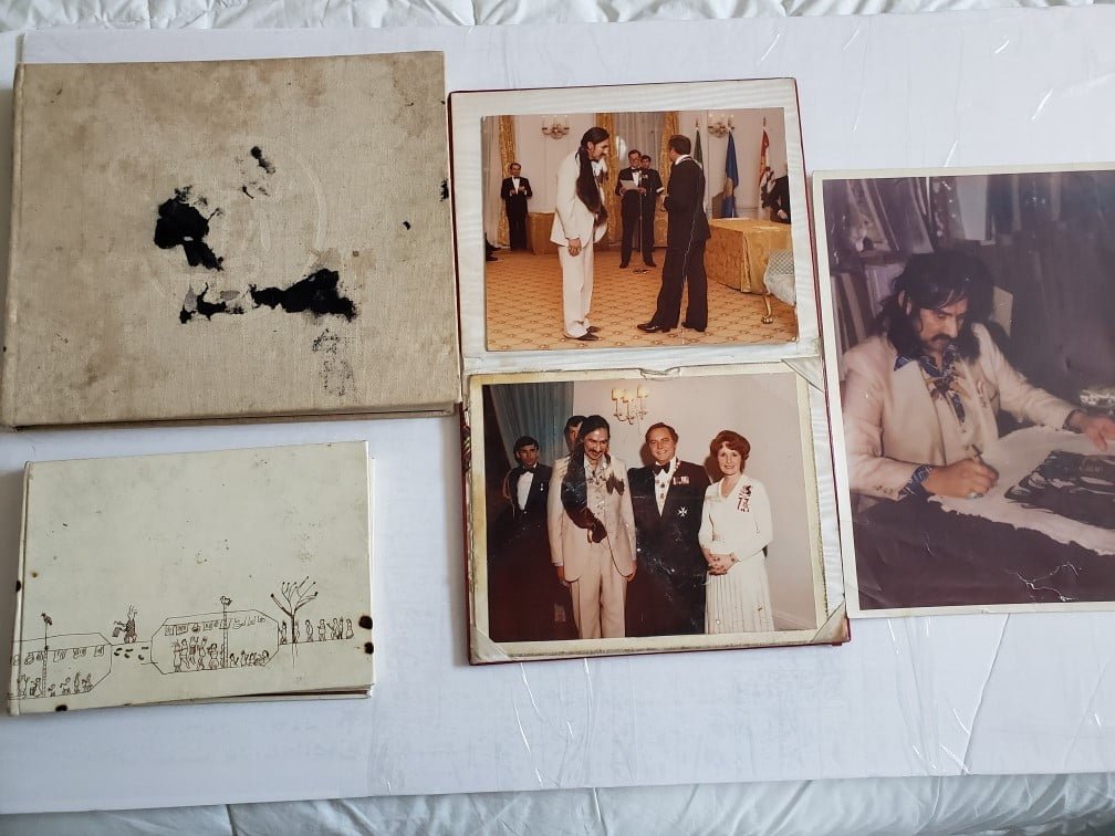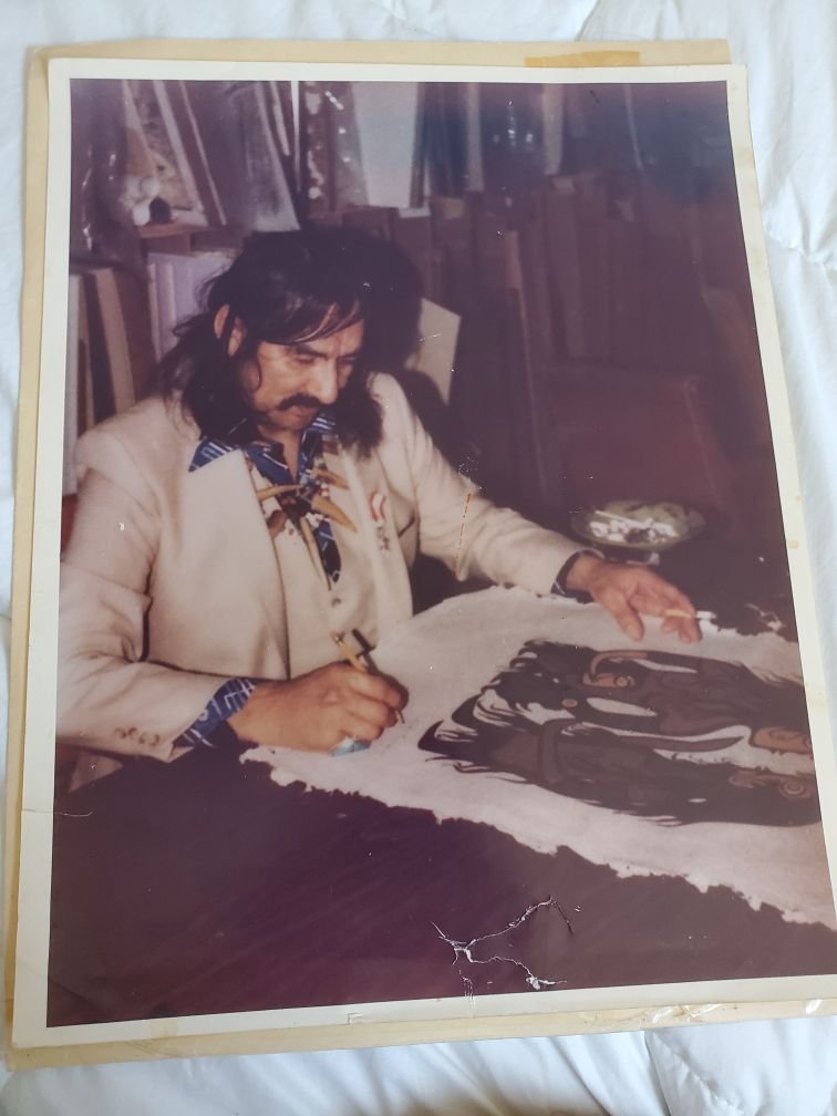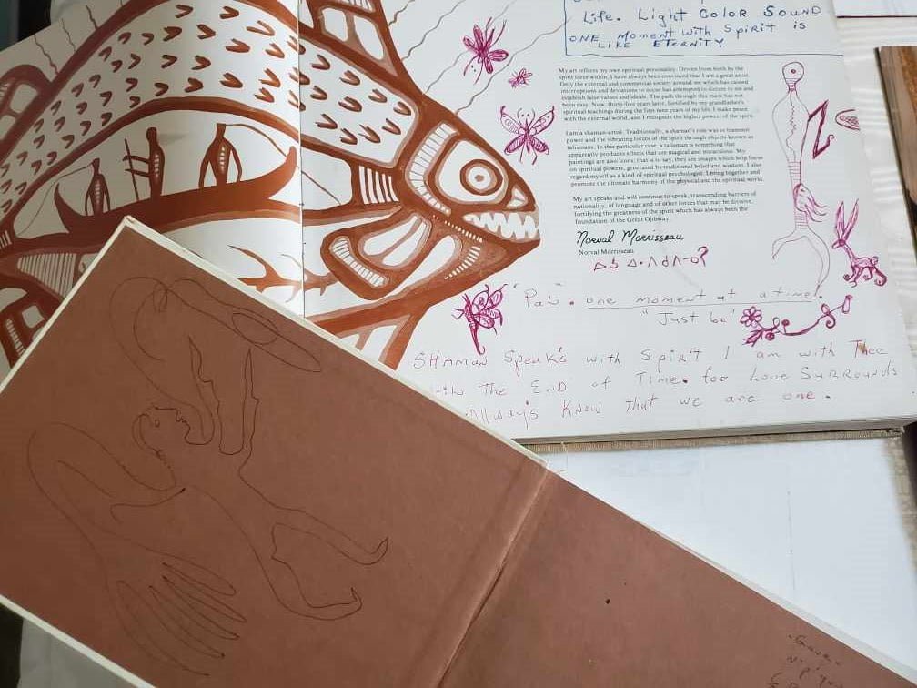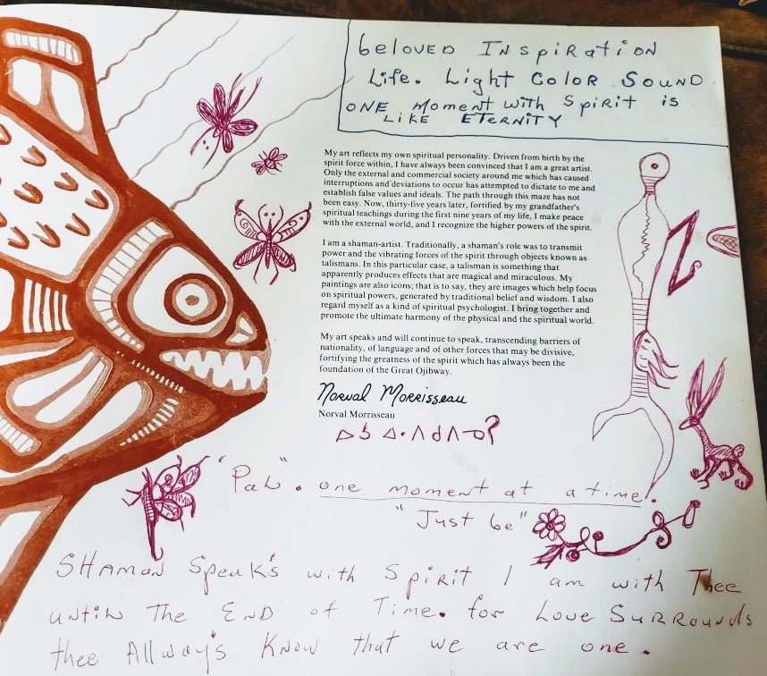 Circa 1986, through a series of unfortunate events Morrisseau’s paintings and possessions including books, photos, and other painted artifacts were left behind, as he fled Ontario for Jasper. The particulars of Morrisseau’s West coast oddysey will at some point be disclosed. In 2019 these items resurfaced, including this 36 x 24 inch gem of a painting and Norval’s copy of the 1979 book about him produced by Jack Pollock, The Art of Norval Morrisseau. The book includes original pen drawings by him along with his handwritten messages apparently directed at his ailing friend and former art dealer, Pollock. Essentially his message to his friend was to “Just Be”. As the tale goes, Norval changed the painting’s title in order to gift it along with the book to assist Jack with his recovery.