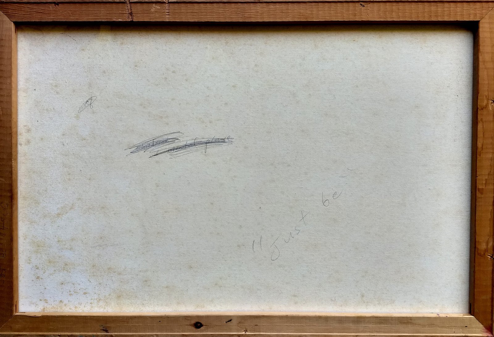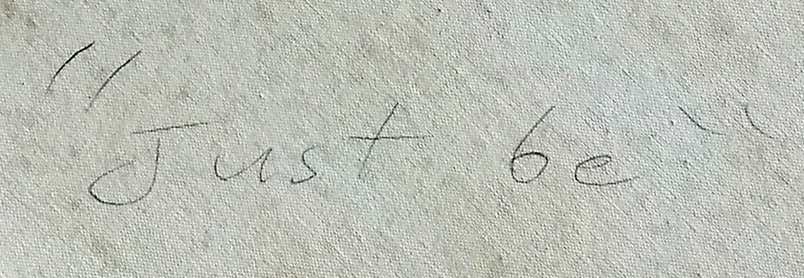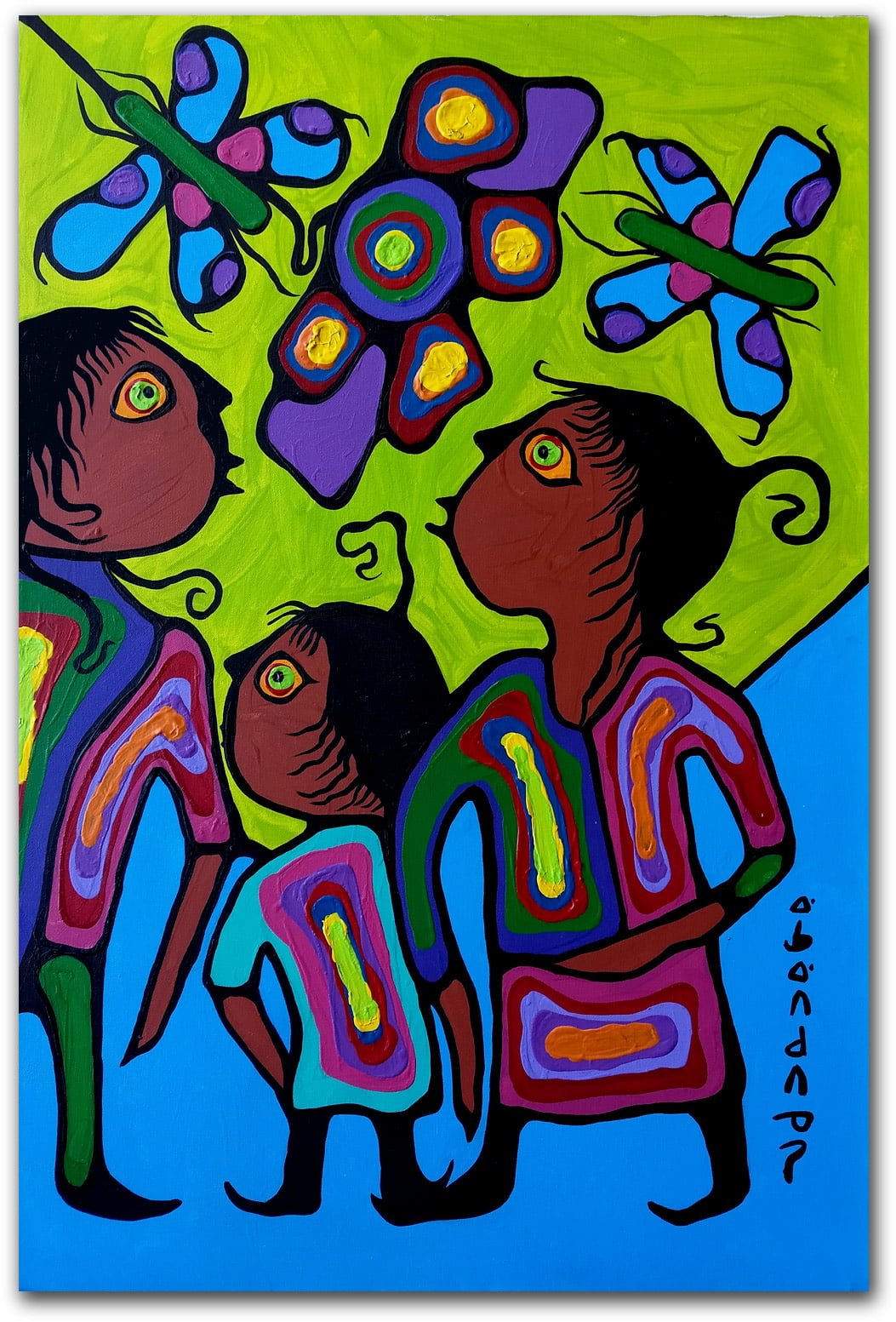 “Just Be” is an important Morrisseau painting created during a largely undocumented period. This delightful depiction of children playing in a butterfly garden is unique for the early 1980s and perhaps even prophetic of the joys he would experience a decade later as a grandfather. Morrisseau chose to title the painting in pencil on the verso, “Children of Mental Plane”, before crossing it out, only to later write a new title, “Just Be”. The as-of-yet uncorroborated story behind Morrisseau re-titling this painting I find both fascinating and reasonable.