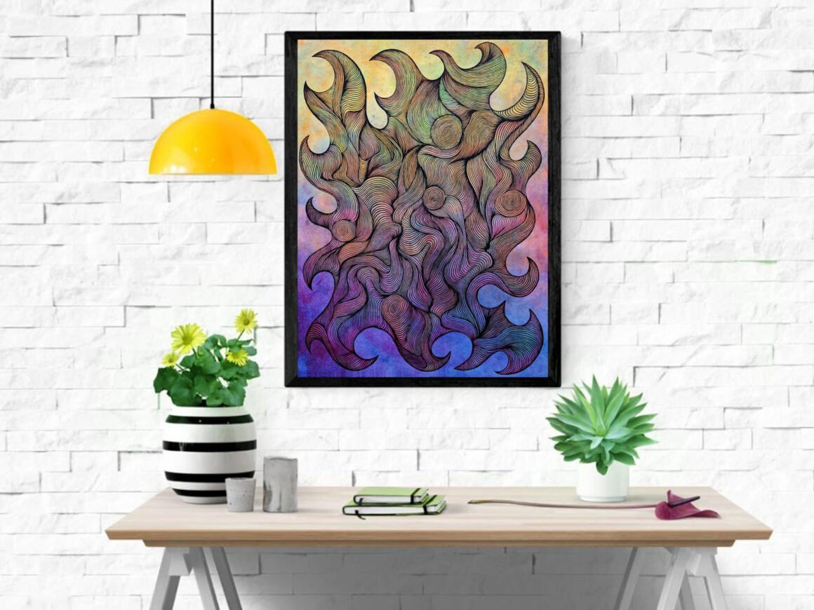 Summerings was created utilizing fluorescent paints to give it an extraordinary magical effect when illuminated by ultraviolet light (black light). The vibrational lines throughout were painted using a brush – not a marker. Brona Wingell